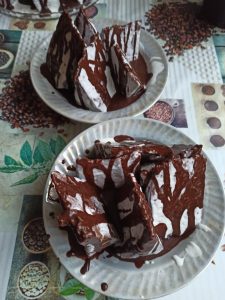 Ho fatto la torta! Una porzione grande per Vova ed altre 2 porzioni per vicini. Farò le porzioni di notte quando Vova dorme. Siamo già al buio.