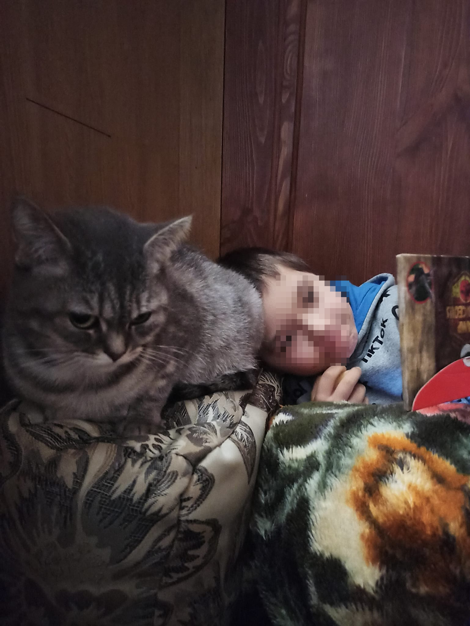 E questo è un figlio sul suo letto fatto di cuscini sul pavimento, accanto a una gatta incinta. Partorirà molto presto!