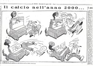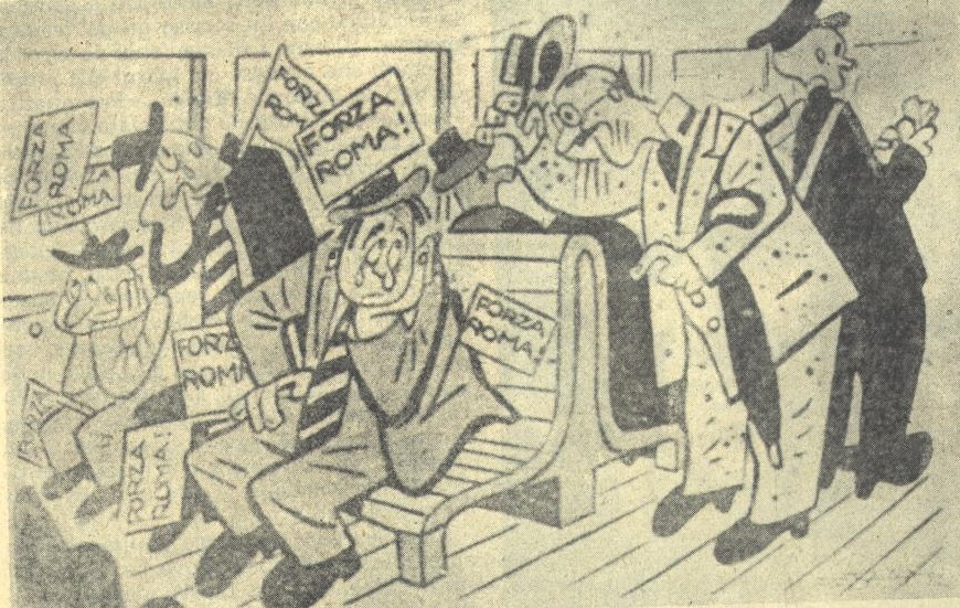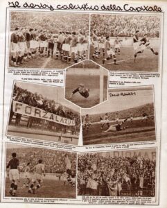 Più diffusa era la lettura de Il Littoriale e del settimanale satirico Il Tifone, che accoglievano le migliori firme giornalistiche. Altri supporti del tifo domenicale erano l’agendina col calendario del campionato, il programma pre-gara, gli imbuti per incitare a voce, le visierine di stoffa tipo tennis, il giornale trasformato in copricapo parasole in stile muratore, la brilluccicante spilletta sul bavero della giacca. Naturalmente, di teppisti allo stadio col preciso intento di scatenare casini, Campo Testaccio e il Nazionale, dove ad un certo momento si accasarono le aquile che notoriamente avevano nei figli maschi del Duce i primi tifosi, non se ne registrarono mai.