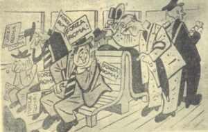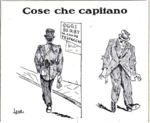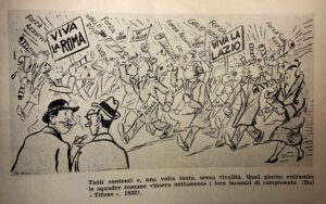 L’idea che il laziale fosse un “soggetto”, un elemento della minoranza esecrabile e, in quanto tale, cojonabile e perfino un poco bullizzabile, prese piede in quegli anni di consenso al fascismo. Gli “indifferenti” da un verso, lo erano molto meno quando si trattava di discettare di calci inferti a un pallone di cuoio. Me ne sono accorto scrivendo i miei due libri sul tifo romanista. Su alcune rubrichette di giornali sportivi, soprattutto il Tifone, Arcitifo Sportifo ma anche sul Littoriale, si avvertono i classici sintomi: le telefonate a casa dell’amico laziale per sfotterlo dopo il derby; le vignette satiriche dove l’aquilotto appare invariabilmente un allocco; i bar Ferraris e Masetti nei quali l’avventore biancazzurro se la vede spesso brutta, al punto da scappare di corsa senza consumare quanto pagato; i talk of the town di personaggi tifosi messi in caricatura, che ripropongono battibecchi tra le due specie umane col romanista nelle vesti del “quirite setteggenerazzioni” difensore del “prestiggio della Capitale”, alla Tinéa proprio, sicurissimo del fatto suo. E, davanti a lui, minino minimo rispetto alla maestà dell’altro, il laziale borghese a volte dandy, cauto al limite del pavido e che non trova le risposte a tono, pure se lo si intuisce più colto. Non ancora burino, no: quella sarà una trasmutazione del dopoguerra. Ve ne parlerò nella prossima puntata.