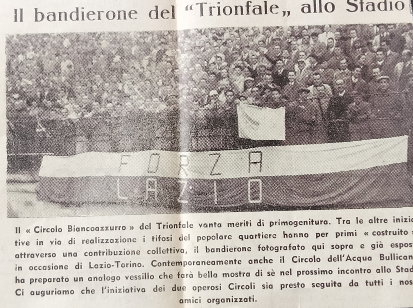 Nella storiografia del tifo, Mario Pennacchia nel suo libro del ’69 non accenna alla novità. Maurizio Martucci, scrivendo nel 1996, ricorda la proliferazione dei circoli, ma senza riferimenti a quelli romanisti. Siccome l’emulazione è la madre di tante cose buone e cattive, non ci sorprende il gioco a rimpiattino tra i due club dell’Urbe. Secondo le mie ricerche, il Circolo Tifosi Bianco-azzurri del Trionfale è il primo a nascere, in una riunione di trentasei aderenti tenuta al bar Allegria in via Andrea Doria il 23 settembre del 1951; proprio il quartiere Trionfale, oggi da molti indicato come il vecchio cuore della tifoseria biancoceleste.