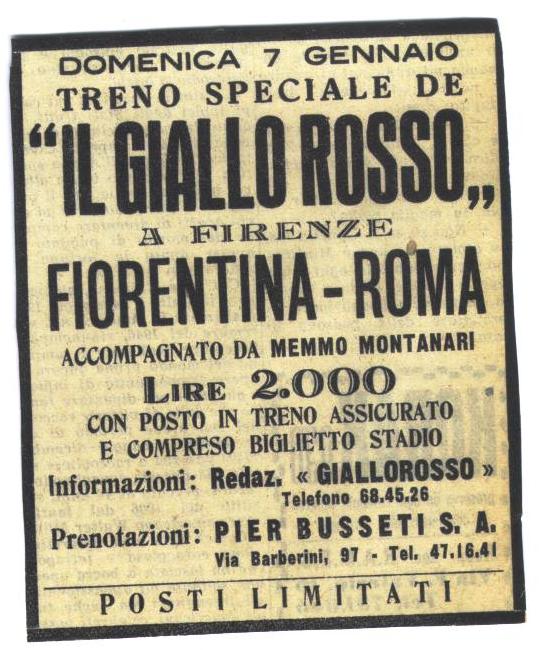 La storia andò così. Nella stagione ’50-51, per sostenere i lupi che non mordevano più e rischiavano la B, due tifosi eccellenti, gestori di famosi locali di ristorazione, Peppino Catena e Giuseppe Montanari, organizzarono la cosiddetta “Spedizione dei Mille”: un viaggio in treno speciale alla volta di Genova. Un mese dopo, in occasione di un Roma-Napoli fissato al 19 novembre 1950, lo stesso Montanari e un altro tifoso, Angelo Meschini, fecero uscire il primo numero del settimanale Il Giallorosso, “organo della tifoseria”. Il giornale servì come piattaforma per creare un Circolo Tifosi Giallorossi che si sostanziava di gruppi di tifosi che, da due o tre anni, nascevano senza soste nei bar; c’era pure un grosso movimento che si chiamava Fiaccola Giallorossa, che aveva raccolto 13.000 firme, compresa quella dello scrittore pescarese Ennio Flaiano, per il ritorno di Fulvio Bernardini come allenatore. Montanari, un omaccione tondo con una voce tenorile che si sentiva in capo al mondo, divenne di fatto l’amministratore unico dell’ufficio viaggi e organizzazioni della AS Roma; rifiutò, tuttavia, di entrare nei ranghi sociali in qualità di rappresentante della tifoseria: voleva “mano libera”. Con Montanari, possiamo dire che appare sulla scena una figura di tifoso capace di sfruttare economicamente a proprio vantaggio la passione popolare: un tifoso semi-professionista, l’antesignano dei tanti di oggi. Il sostegno non evitò ai poveri lupi la vergognosa retrocessione. Siccome la Roma era molto seguita da personaggi che animavano il panorama cinematografico e teatrale, uno di questi, Renato Rascel l’autore di Arrivederci Roma, la domenica in cui la squadra giocò l’ultima partita interruppe il suo spettacolo al Sistina e, in piedi sul palcoscenico, annunciò serissimo: “Signori, da questo momento la Roma è in Serie B. Viva la Roma!” Ricevette in risposta un boato di applausi.