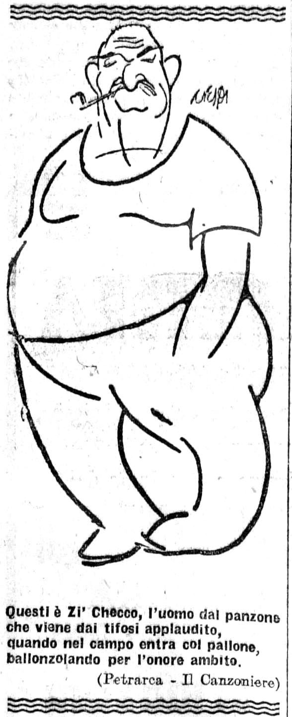 Un zi’ Checco “giovane” nella stagione 1926-27, quand’era custode al Motovelodromo Appio, campo di casa della AS Alba. La caricatura apparve sul giornale satirico Il Tifone.