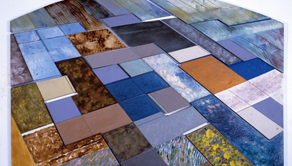 Realizzato nel 1993 con tecnica mista su legno, Tappezzamento a pezzi è un’opera composta da sette elementi (250×350 cm), ciascuno differente per forma e trattamento pittorico. Acquisita nel 1999 dalla Sovrintendenza Capitolina in seguito alla partecipazione dell’artista alla rassegna Lavori In Corso negli spazi della ex Birra Peroni, rappresenta un unicum nel percorso artistico di Mambor e un momento cruciale del suo ritorno alla pittura dopo anni di intensa attività teatrale.