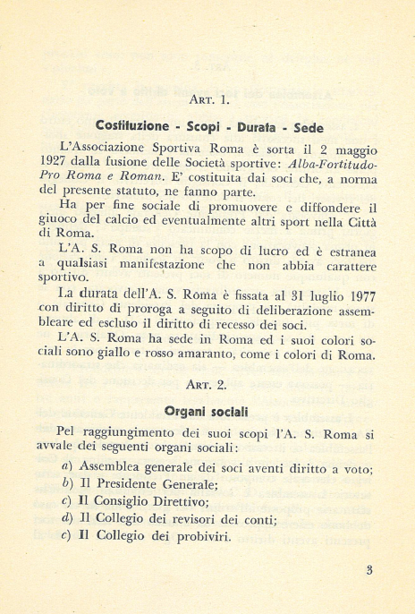 Serie di conciliaboli dai quali sortì, una settimana più tardi, l’elezione alla presidenza del futuro politico democristiano Pietro Baldassarre. Baldassarre che, per altro, nell’itinere delle discussioni si disse convinto che la ASR fosse esistita, fino a quel momento, priva di un contratto sociale di natura giuridica. Si stilò, allora, un nuovo statuto, poi confermato, con modifiche, nelle assemblee del 20 marzo 1950 e 2 luglio 1951. E in quest’ultimo statuto – il più vecchio disponibile oggi della AS Roma – la data di nascita è chiara: 2 maggio 1927.